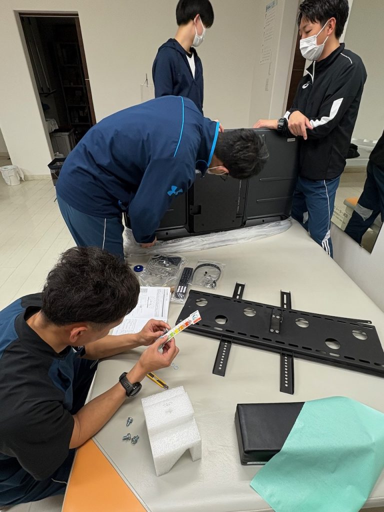 ポール看板の設置が完了。1Fリハビリ室の器械配置をしました。